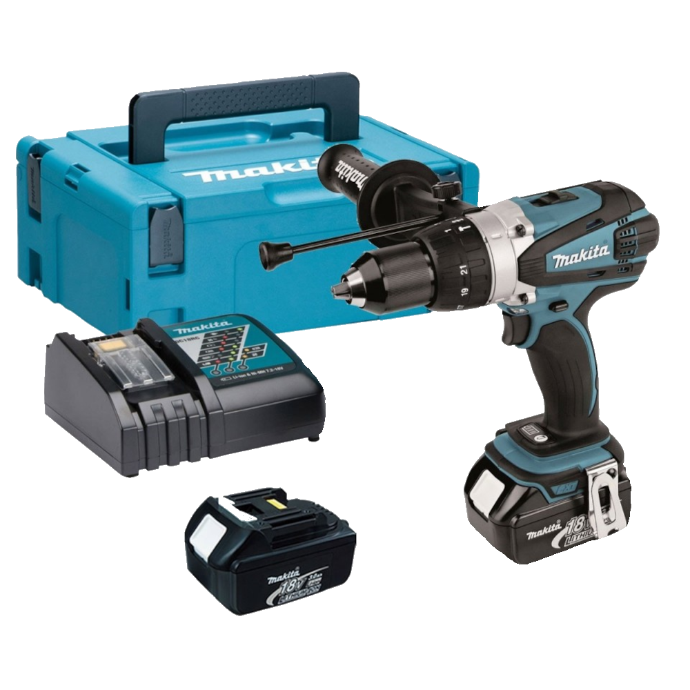 Masina de gaurit/insurubat cu percutie cu 2 acumulatori Makita DHP458RFJ